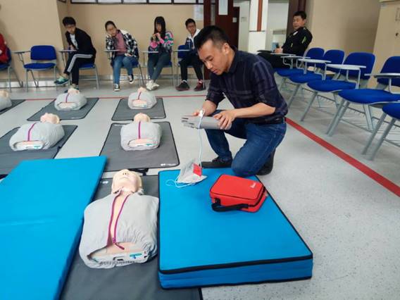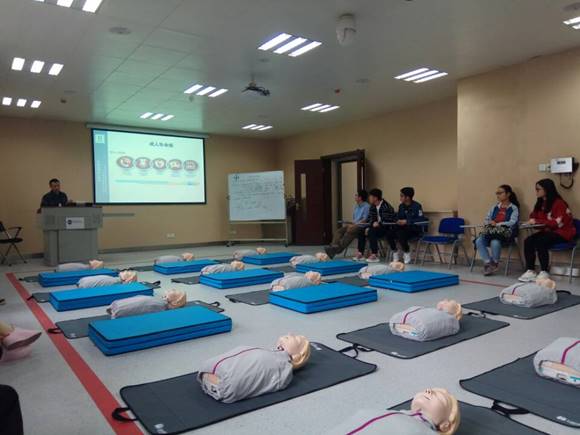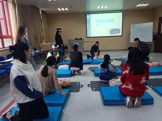 活动的第三个板块是非常实用但又最容易在急救姿势和流程上出现差错的的CPR(心肺复苏)技能,刘代骏老师担任此次的主讲老师。在刘老师详细、生动地将原理、步骤和需要格外注意的内容讲解完后,同学们就两两共同使用一个模拟人,相互配合上手练习CPR,将老师刚才所讲的知识应用到实践训练中。其间大家相互配合,十分投入。大家在亲自实践了之后,才意识到了正确学会CPR的重要性和必要性。最后,刘老师还拿出了便携式除颤仪(AED)以及呼吸球囊向大家展示CPR+AED+球囊的使用方法和流程,希望大家在公共场合遇到此类情况时可以辅助施救者正确找到它以便施救。