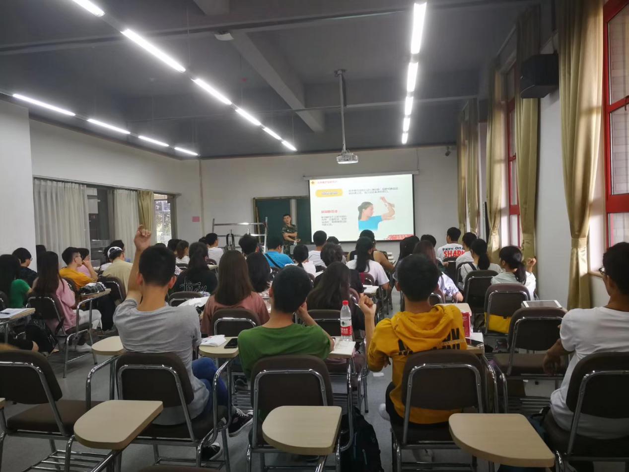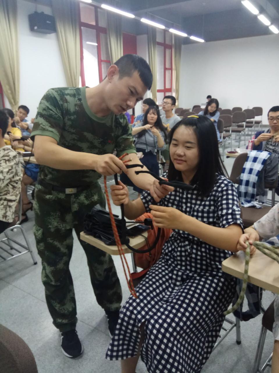 任震震老师以应急意识和减灾意识培养为出发点,为文化行者协会的近100名学生(分上下午两个班)讲解和演示了简单的止血、包扎和受伤人员固定、搬运的方法和技术,并详细介绍并且实物演示了包括水结、渔人结在内的共计十种求生绳结。课程内容丰富多彩,任震震老师讲课专业详细而不失幽默、引人入胜,得到了同学们的一致好评。授课中,同学们仔细听从老师的指导和安排,积极参与每一次的实训实践,为团队的安全和项目的顺利开展认真地做知识储备。大家对任震震老师的讲课表示自己从中受益匪浅,以热烈的掌声对老师表达了感谢。