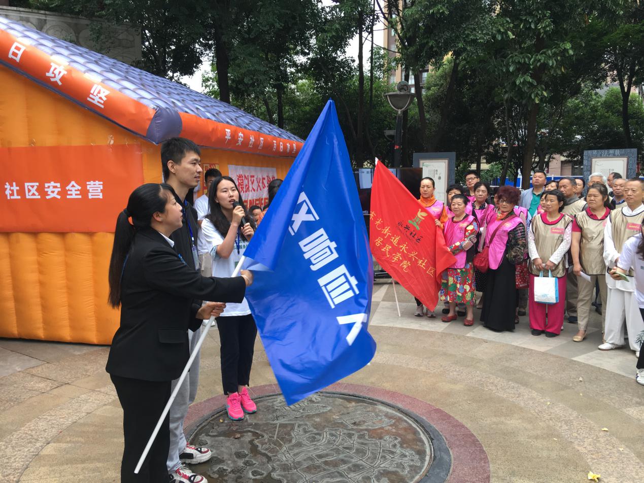 活动开始前,四川大学防灾减灾科普基地负责人曹丽发表讲话,指出社区安全作为整个社会安全体系的基础结构,易于受自然灾害、事故灾难、公共卫生和社会安全事件风险的威胁,强调了社区安全应急实训科普的重大意义,简要介绍了此次科普教育活动的主要内容板块即:初期火灾处置、模拟烟雾逃生、模拟119报警体验,并讲解了操作要点和专业知识。随后,四川大学防灾减灾教育科普基地课程老师许成哲分别向“院落守护人队”和“社区响应人队”的领队授旗,宣告“活力永兴”社区安全营正式开营。