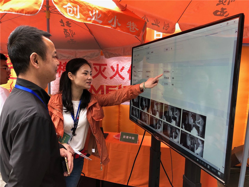 灭火帐篷中,参训居民认真听取了主讲人提及的动作要领,配合自己的实际体验,正确使用灭火器将模拟火焰扑灭,实训合格与否,查看帐篷外数据中心的智能数据测评便可获取。