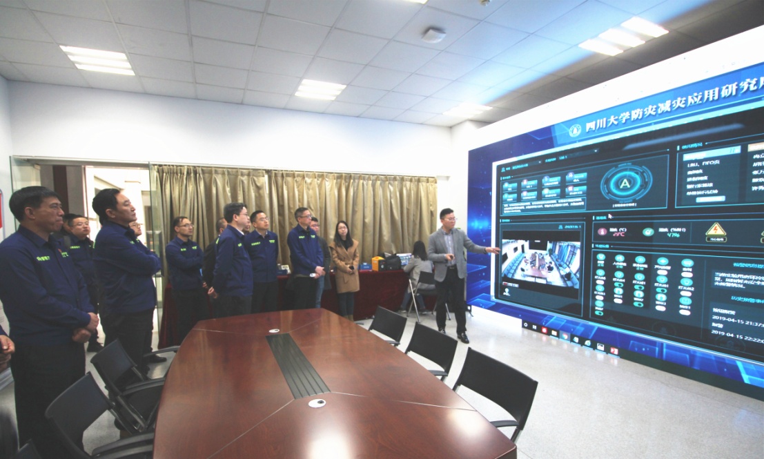 最后,参访一行观看了四川大学防灾减灾应用研究的成果展示,包括“校园实验室突发事件指挥调度系统”、“智慧指挥调度系统”、“北斗亚米级定位设备”、“水位监测系统”、“大数据与地灾风险信息系统”、“工程结构防灾减灾”等,充分展示了我院在应急管理领域丰富的教学和研究成果。