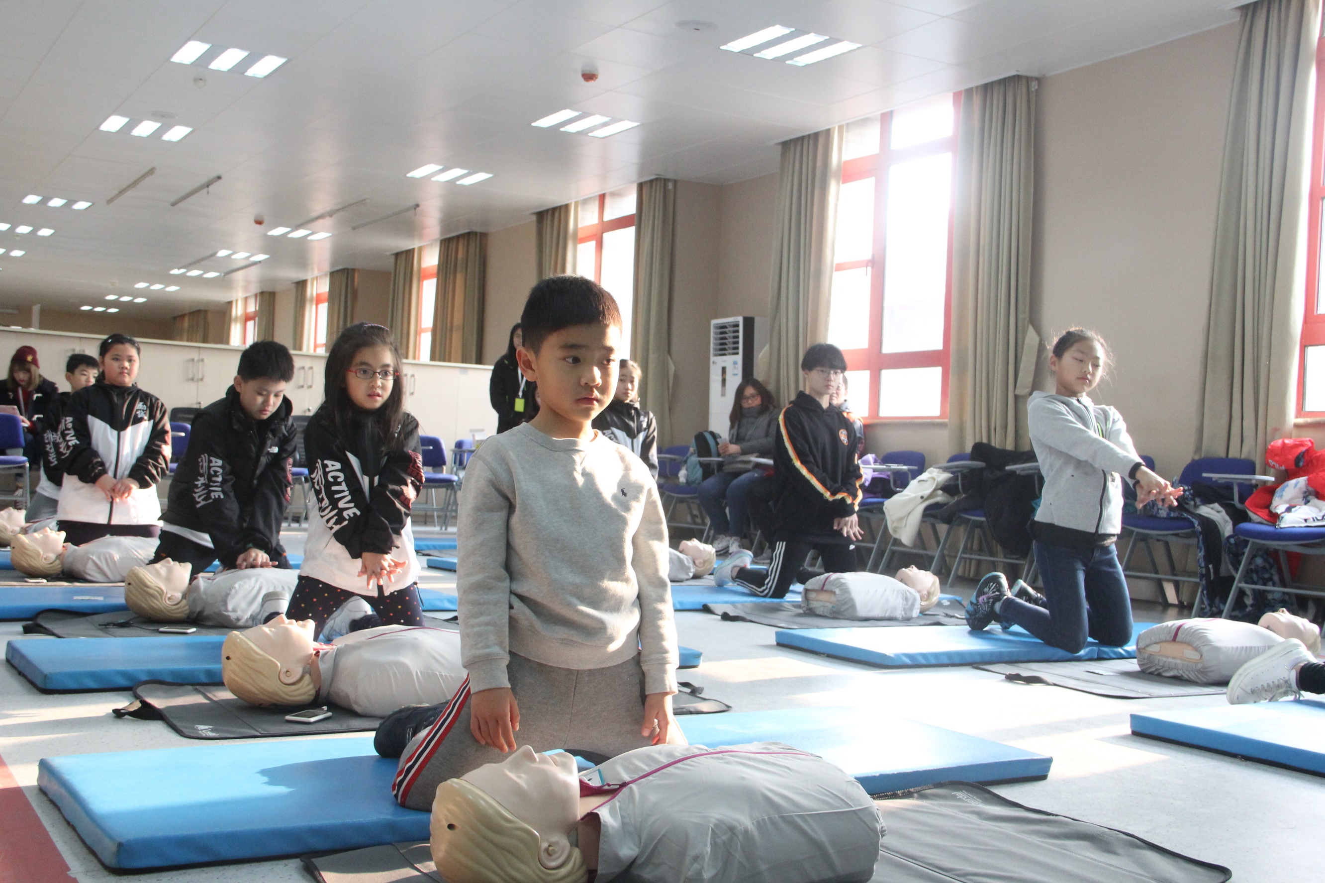 结业典礼举行之前,50多名香港师生代表在中心参加了“初期火灾处置”“火灾逃生与自救”和“医学急救基础技能”三个板块的防灾自救课学习。