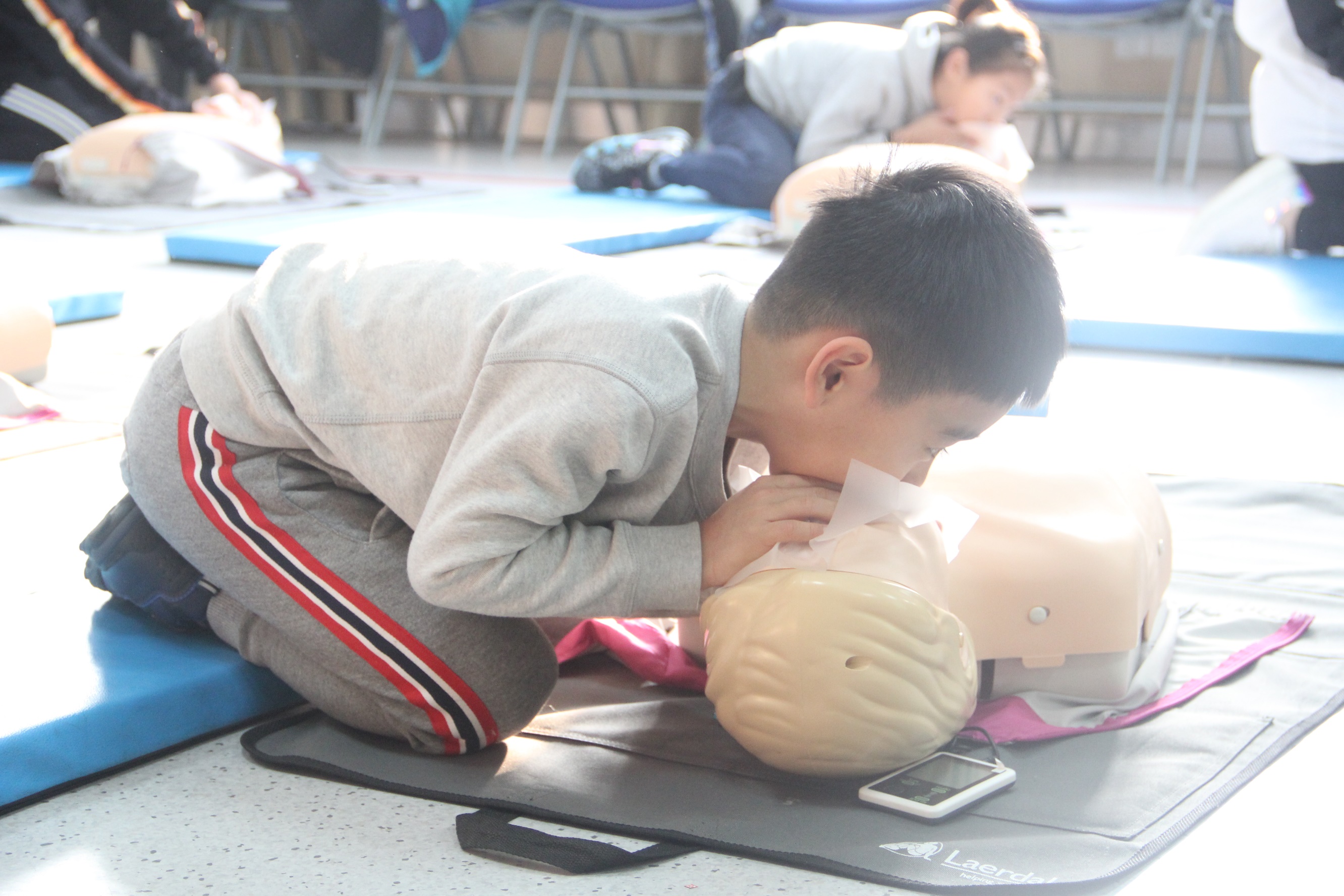 “医学急救基础技能”是同学们感觉“最累”但又想再次学习的课程。“老师我好累,已经按了30下了还要继续吗?”“老师我还想再体验一次可以吗?”等提问让课程老师感受到香港同学的热情好学与童稚可爱。该课程旨在让香港师生通过亲身体验,学习心肺复苏(CPR)技能和 AED 除颤仪的使用方法。