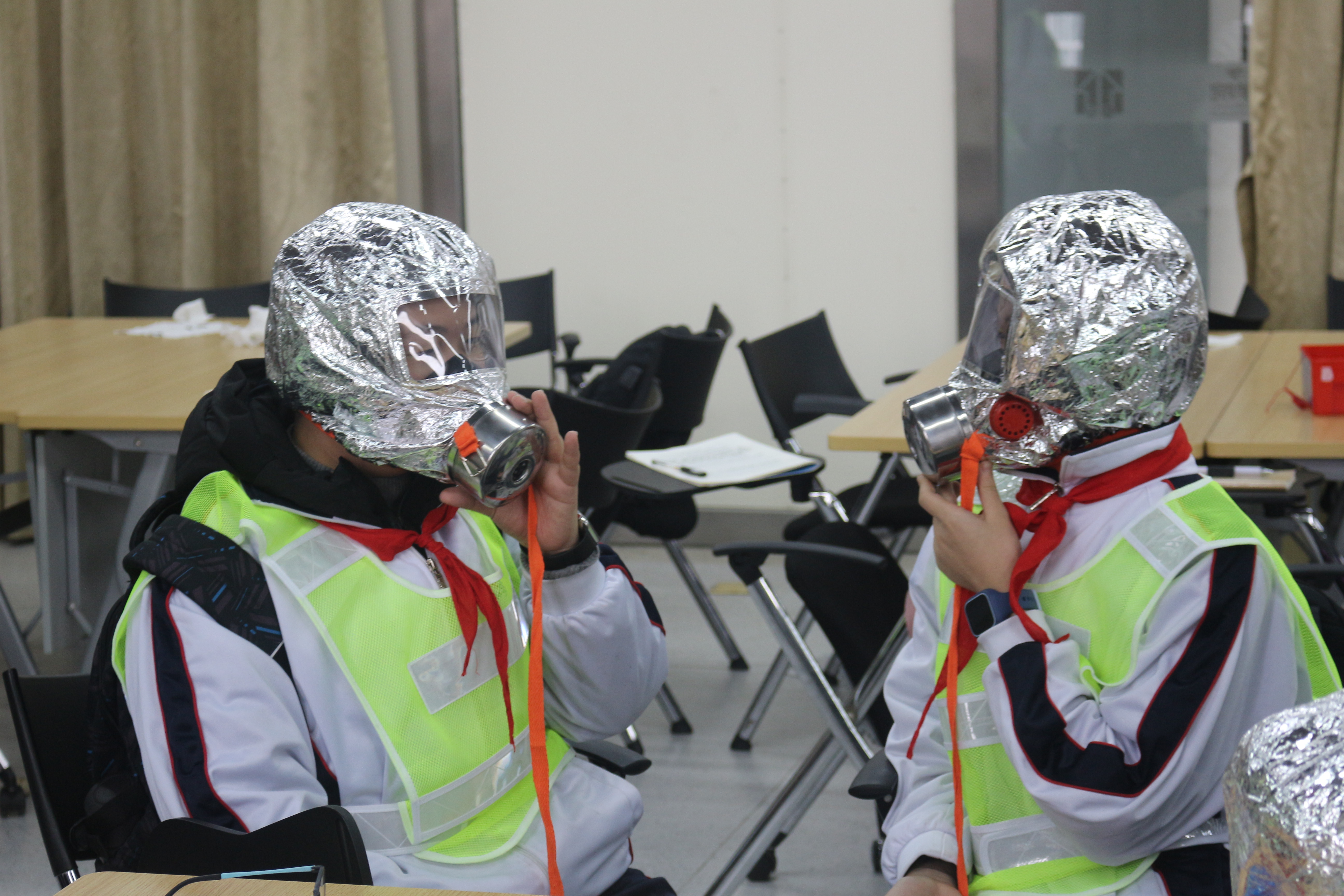 火灾逃生与自救板块也采用此种教学方式,学生先根据自己既有的知识进行火灾逃生模拟演练,老师再对室内火灾逃生技能和防毒面具的使用方法进行讲解,然后组织同学们进行二次练习,使学生更有效地掌握正确逃生要领。