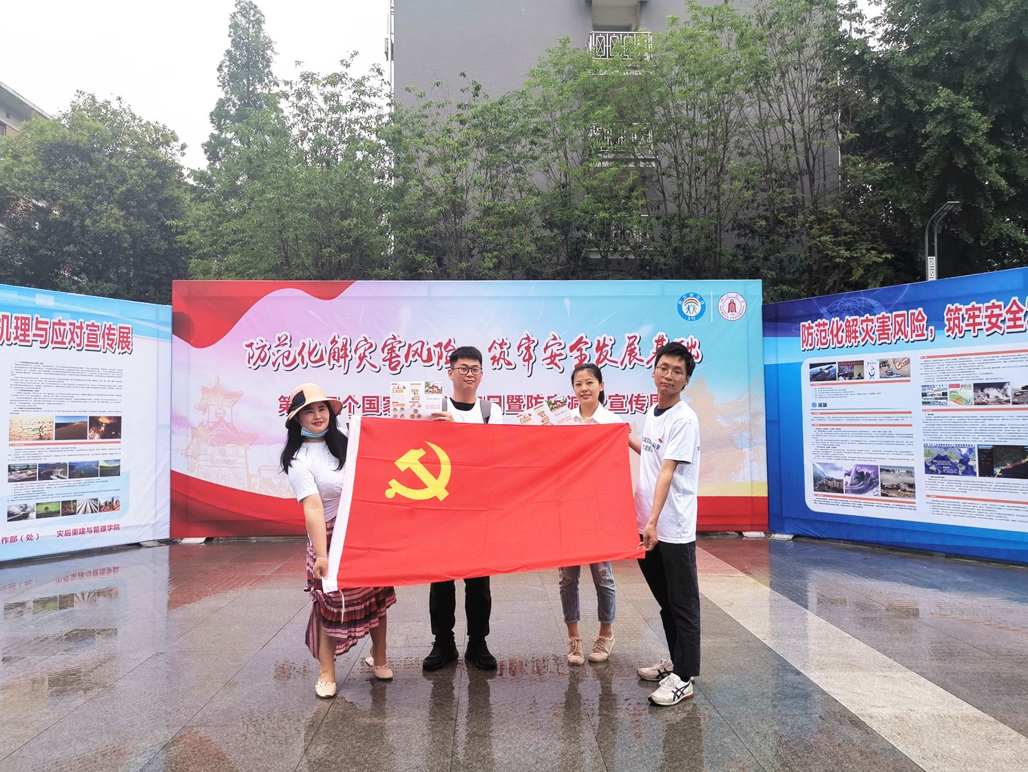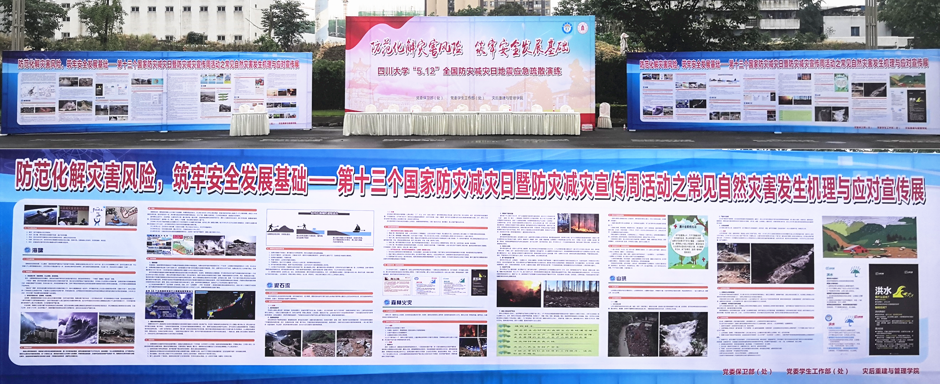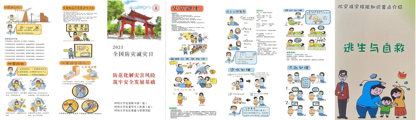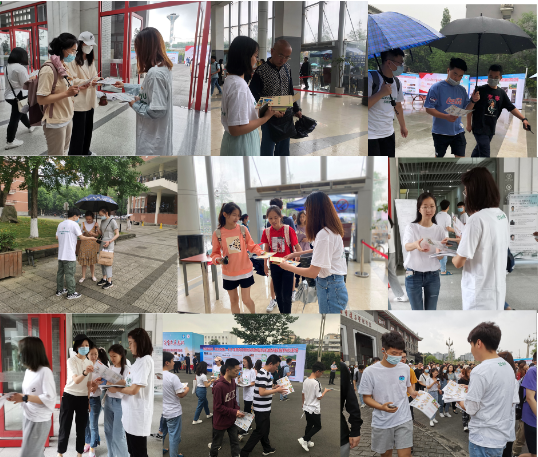 志愿服务队成员分别在学院公共区域、望江校区第一基础教学楼、江安校区青春广场、学生食堂、华西校区毛英才烈士像旁等学生流动量较大的区域发放制作的地震、洪水、城市内涝、滑坡、泥石流等常见自然灾害的发生机理与应对方法宣传展板、宣传单页和逃生自救手册。