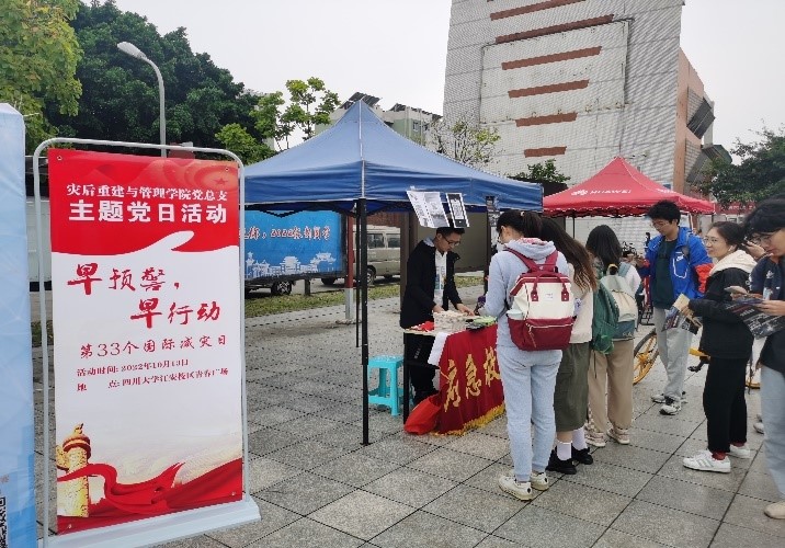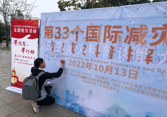 2022年10月13日是第33个国际减灾日,活动主题为“早预警,早行动”。我院党总支与四川大学防灾减灾科普教育基地为切实提高师生安全意识和自救互救能力,构建安全和谐校园,组织学院国际减灾与应急管理学会、应急救援学会以及学院国际减灾与应急管理创新班等,结合学院特色,围绕“早预警,早行动”这一主题开展了系列防灾减灾宣传活动。