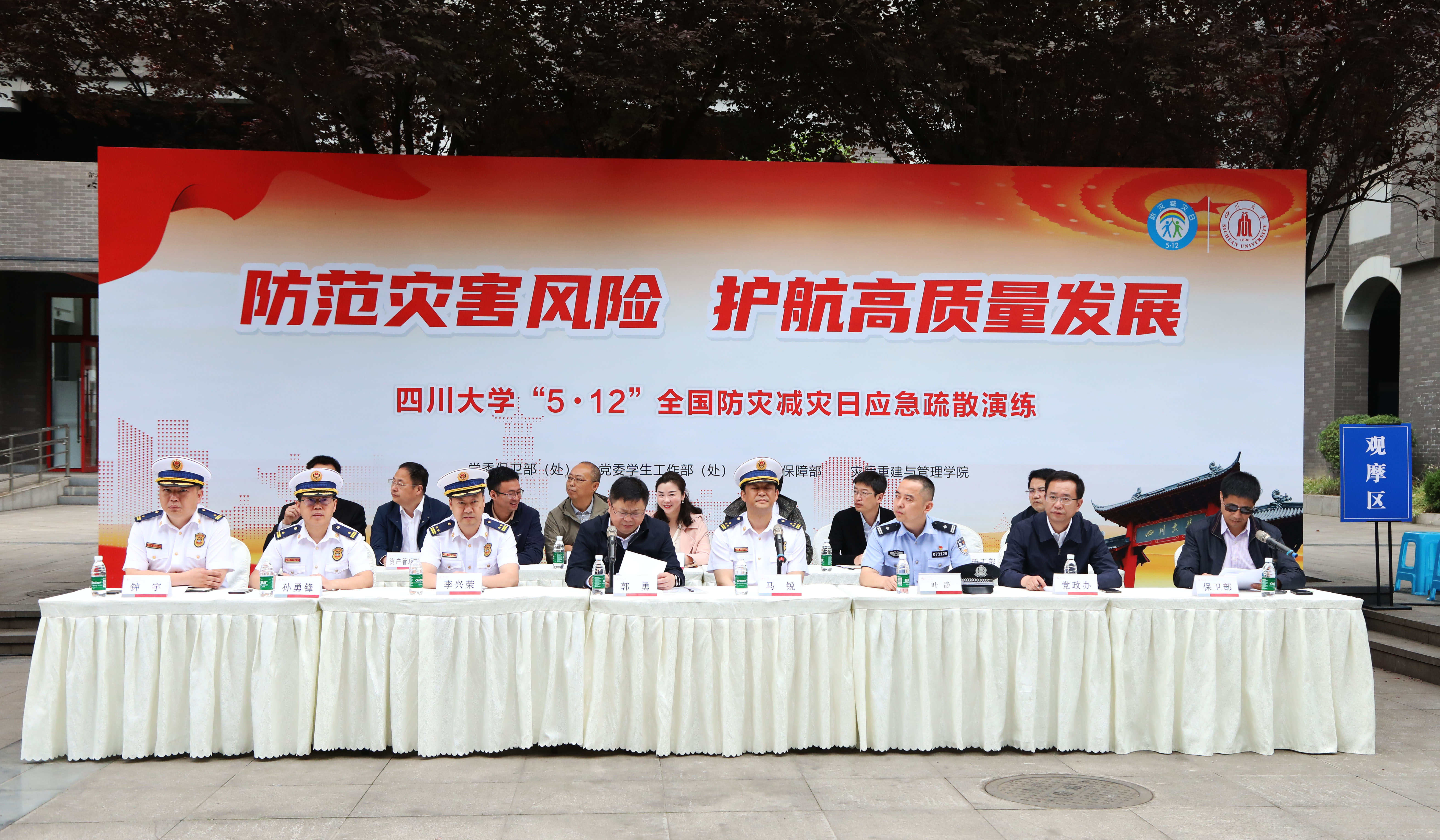 5月12日上午,四川大学“5·12”全国防灾减灾日应急疏散演练在江安校区灾后重建与管理学院举行。校党委副书记郭勇、成都市消防救援支队支队长马锐,学校相关单位和辖区派出所负责人与师生代表参加了演练活动。