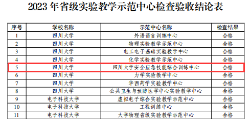 根据《四川省教育厅关于开展普通本科高校省级实验教学示范中心检查验收工作的通知》精神,省教育厅组织专家对省内本科高校201个省级实验教学示范中心开展了检查验收工作。2023年11月17日,四川省教育厅公布了省级实验教学示范中心检查验收结论的通知(川教函〔2023〕439 号),四川大学安全应急技能训练中心经学校自评、省厅组织专家网评和现场抽查,最终检查验收结论为“合格”。