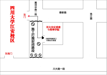 同学们上课时注意以下几点: 1.请上课携带一卡通; 2.本门课程涉及实训,4-12周课程着装要求:运动装、运动鞋,不穿裙子及高跟鞋,长发请束发; 3.注意配合学校的防疫工作; 4.上课地点已经更新,请同学们查看新课表; 5.江安校区东门到灾后重建与管理学院之间正在施工,请同学们注意安全。具体地理位置如图所示: