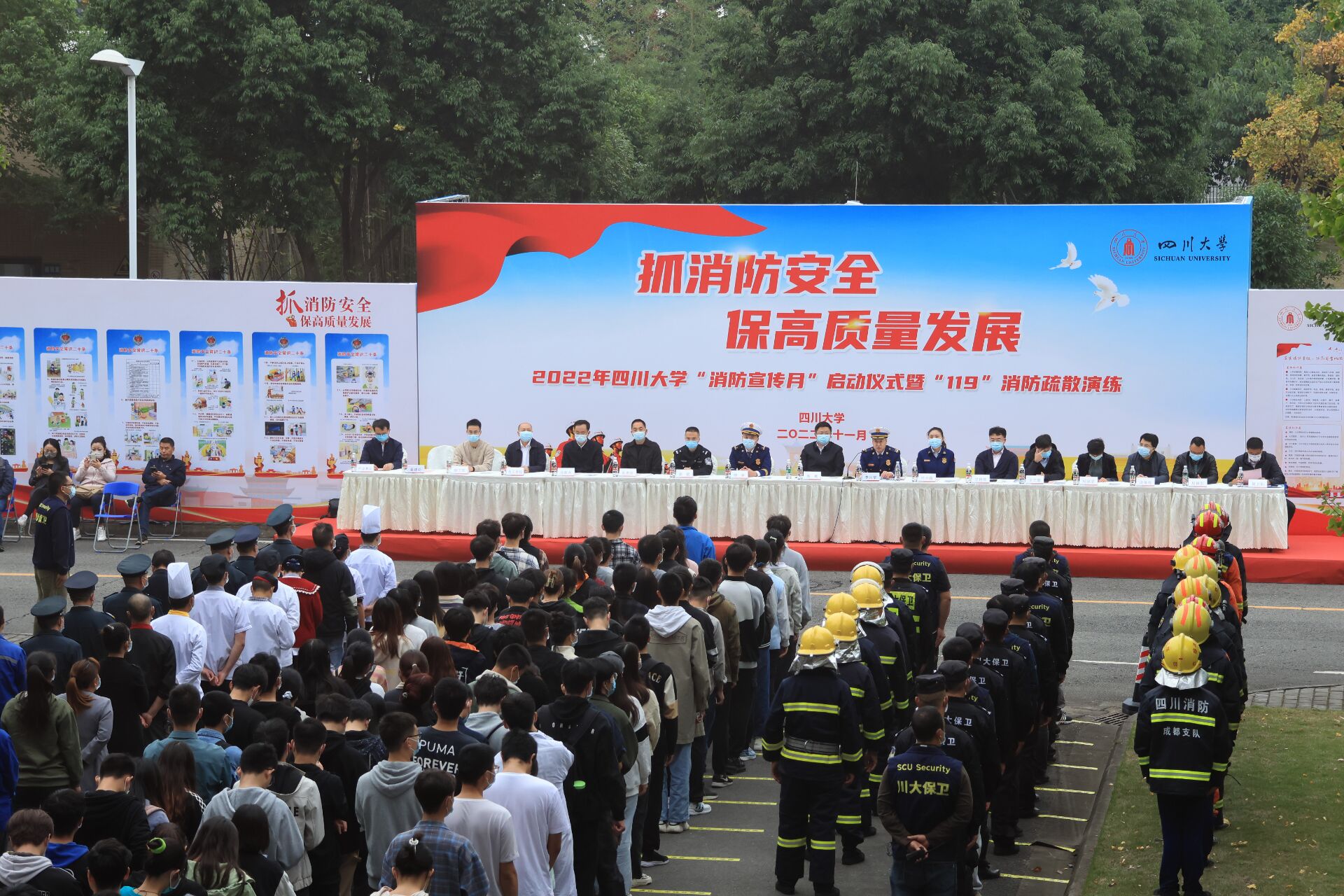 在全国第31个“119”消防宣传日来临之际,11月3日下午,2022年四川大学“消防宣传月”启动仪式暨“119”消防疏散演练在江安校区第一基础实验楼举行。校党委副书记郭勇,成都市消防救援支队副支队长李兴荣,双流区消防救援大队、西航港街道办、双流区航都派出所等相关部门领导,学校相关单位负责人,各学院分管学生工作的副书记和师生代表参加了演练活动。学校保卫处处长夏泽友主持演练活动。