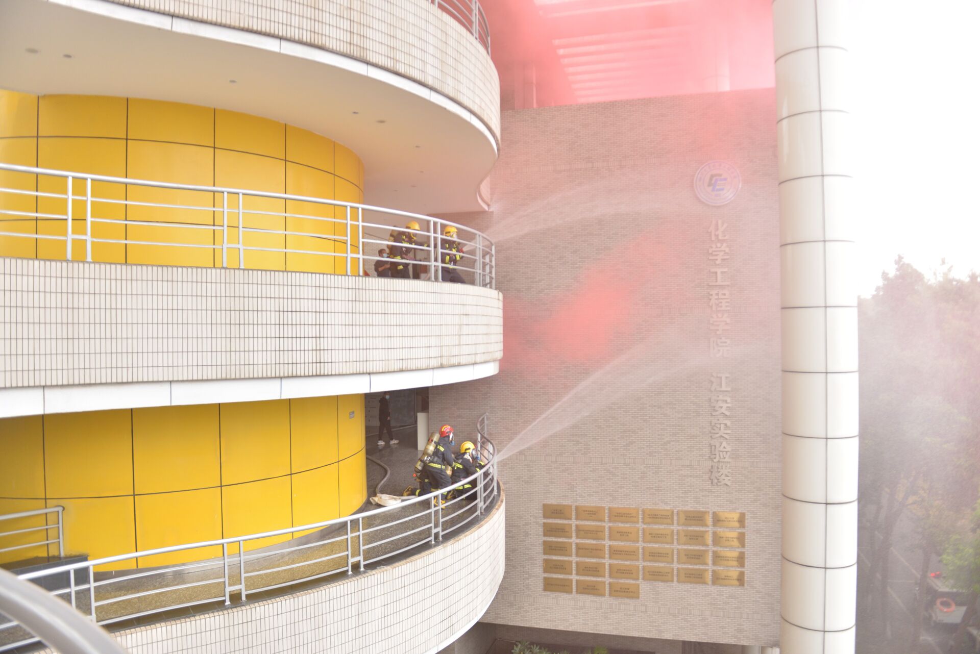 本次“119”校园消防应急疏散演练以实验室发生火情为背景,由确认起火地点,开启声光报警,拨打报警电话,开启疏散广播,紧急疏散,学校保卫处、校医院和消防队进场救援等多个环节组成。